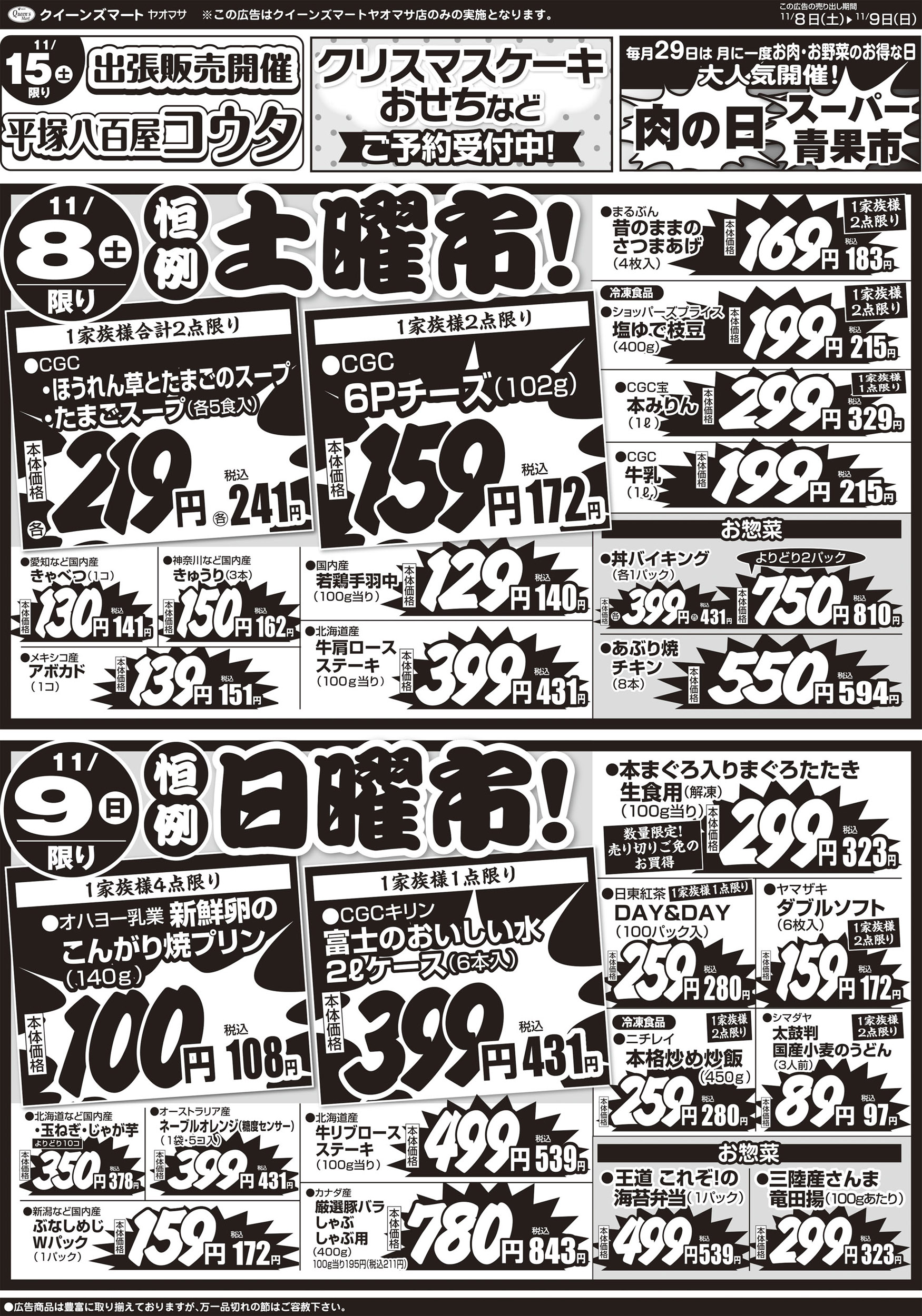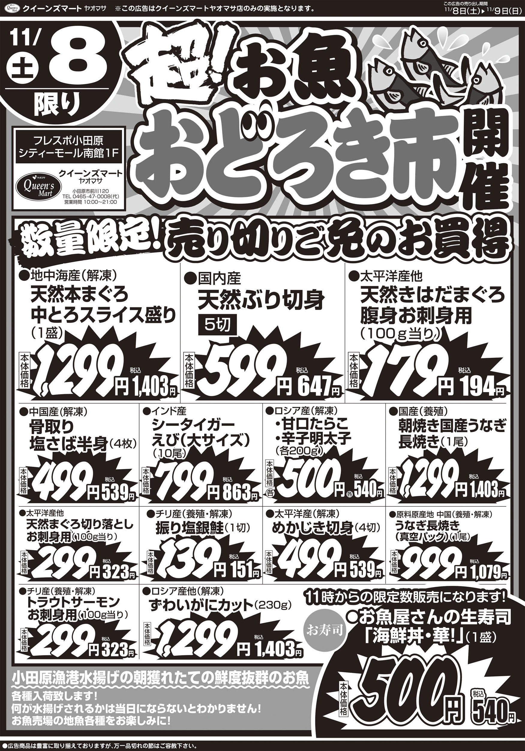 小田原市 クイーンズマート・ヤオマサ ヤオマサグループは、地域社会に密着し食文化を中心とした豊かな楽しい生活を地域の皆さまに提供します!お得で嬉しいイベントも満載!! ピックアップニュース ネットチラシ 料金・サービス クチコミを見る・投稿する もっと写真を見る ネットチラシ 広告有効期限:2025.11.08~2025.11.09 その他のネットチラシ 広告有効期限 2025/11/05~2025/11/11 周辺のチラシを見る 周辺情報 グルメ ショッピング 車・バイク 住宅 暮らし 趣味・レジャー 美容・健康 周辺情報はありません このお店のTOPページへ 0465-47-0008 twitter Facebook Google+