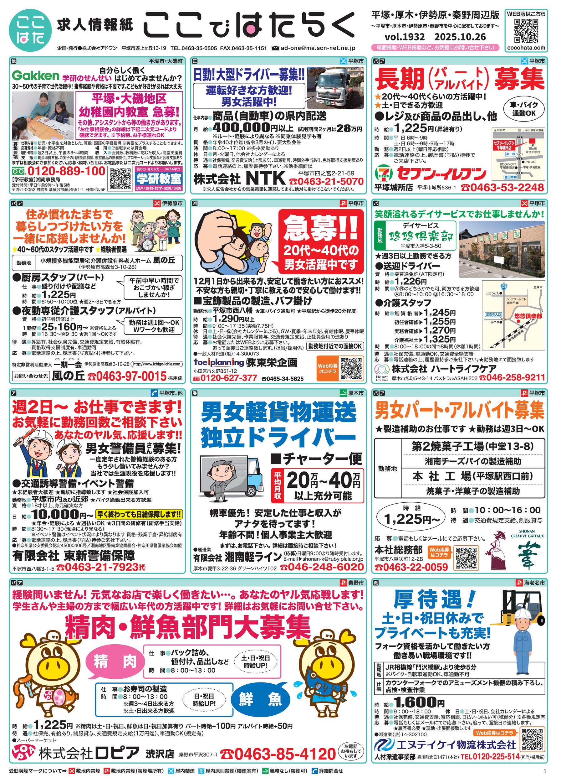 平塚市 アドワン 湘南平塚~秦野版 新聞折込チラシの無料求人情報誌 チラシ クチコミを見る・投稿する チラシ 広告有効期限:2025.10.26~2025.11.01 その他のネットチラシ 周辺のチラシを見る このお店のTOPページへ twitter Facebook Google+