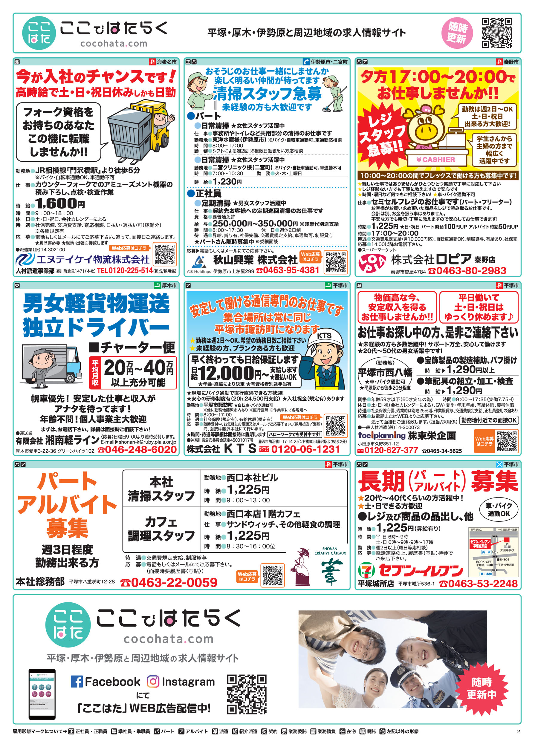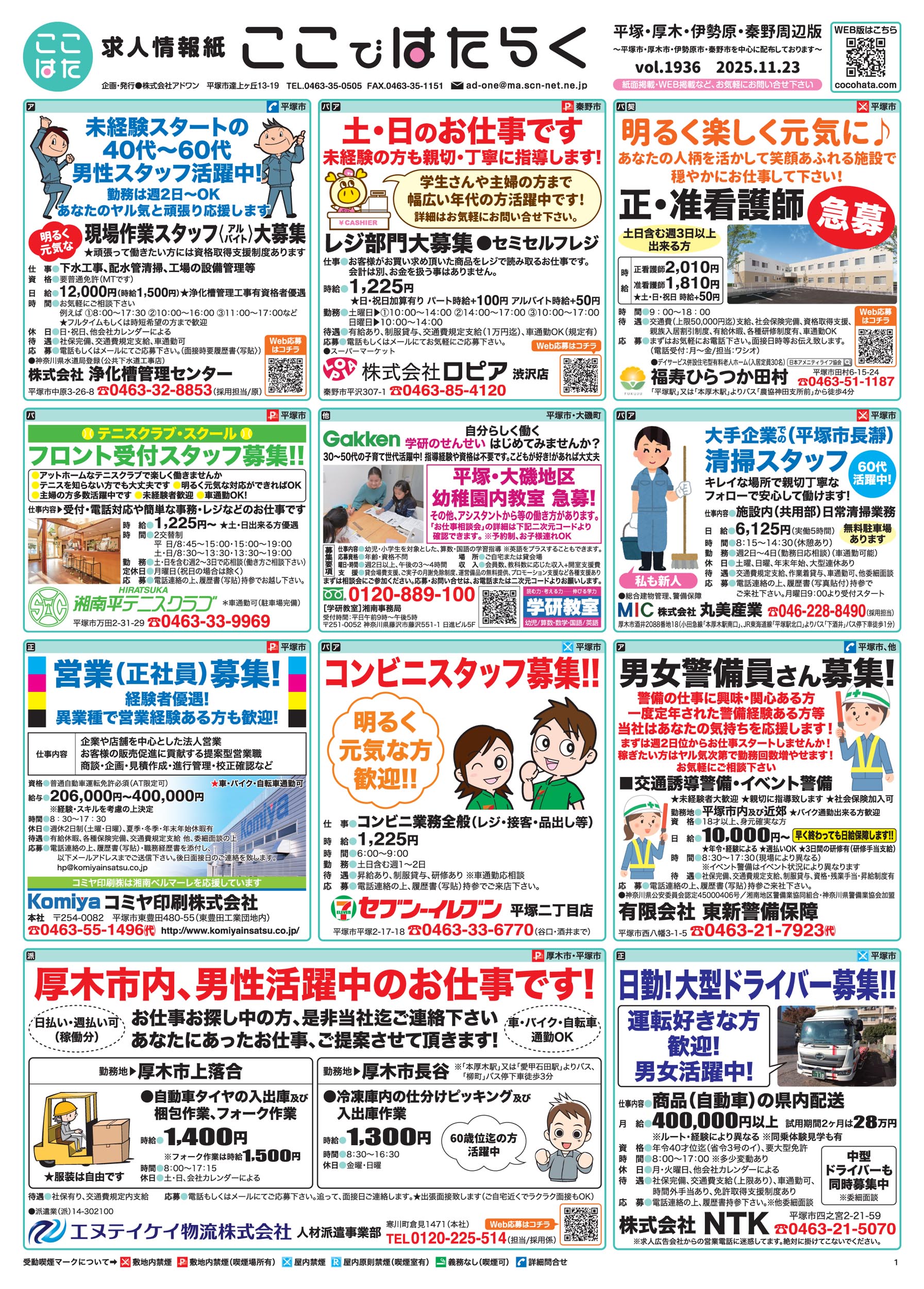 平塚市 アドワン 湘南平塚~秦野版 新聞折込チラシの無料求人情報誌 チラシ クチコミを見る・投稿する チラシ 広告有効期限:2025.11.23~2025.11.29 その他のネットチラシ 周辺のチラシを見る このお店のTOPページへ twitter Facebook Google+