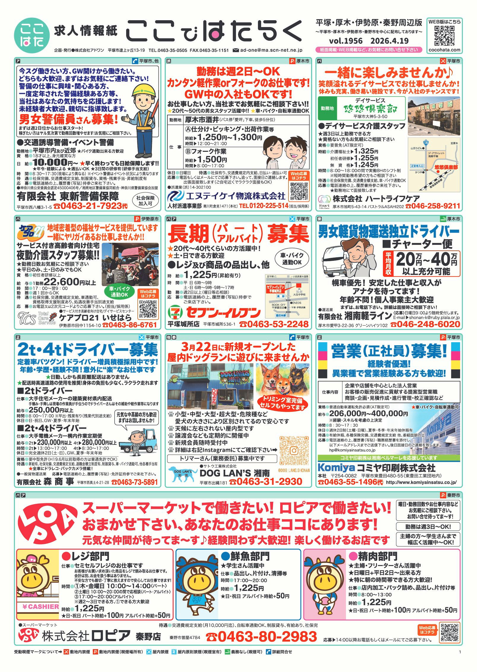 平塚市 アドワン 湘南平塚~秦野版 新聞折込チラシの無料求人情報誌 チラシ クチコミを見る・投稿する チラシ 広告有効期限:2026.04.19~2026.04.25 その他のネットチラシ 周辺のチラシを見る このお店のTOPページへ twitter Facebook Google+
