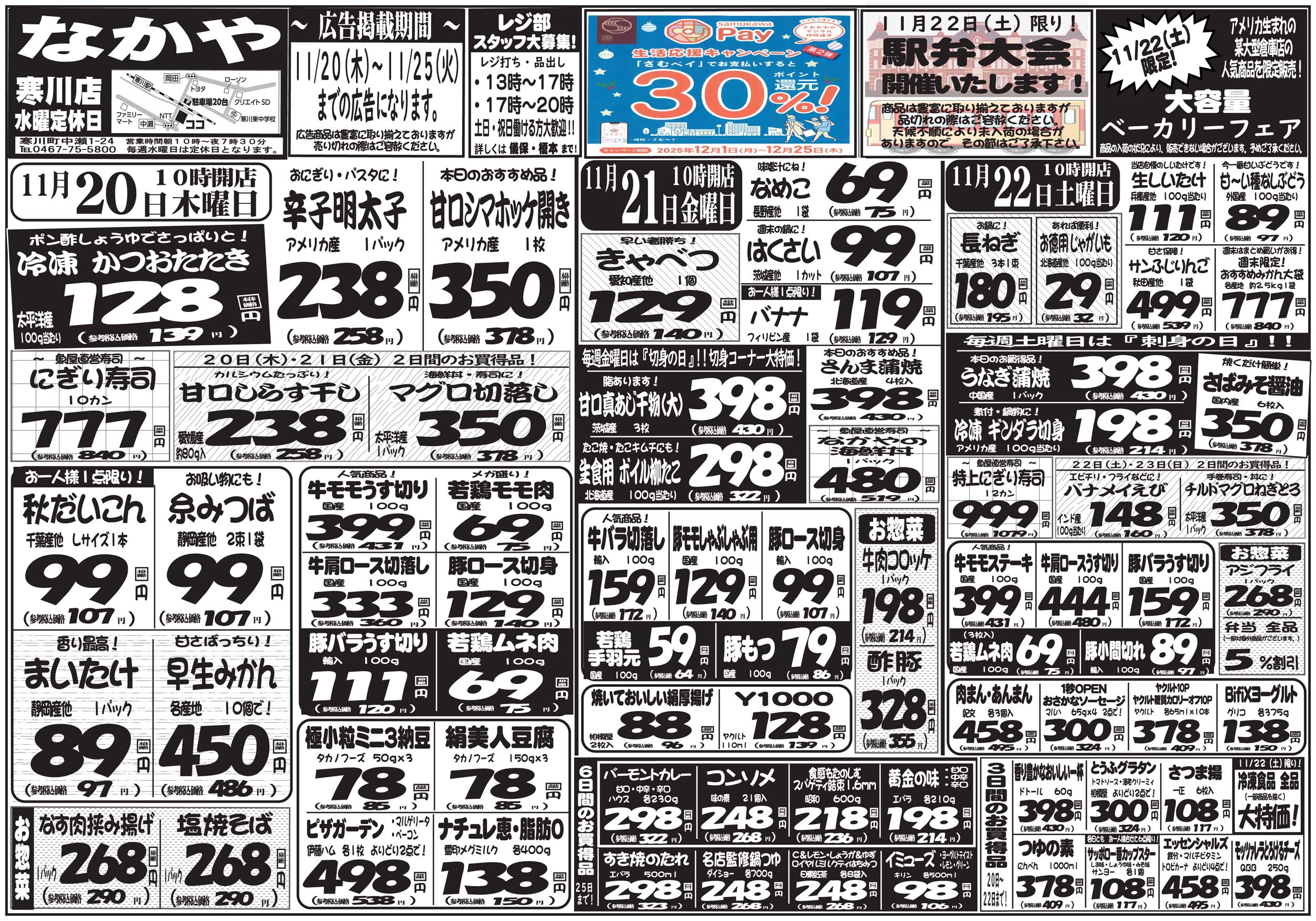 高座郡寒川町 新鮮市場 なかや 寒川店 お客様の冷蔵庫がわりにご利用下さい。お買い得商品は折込チラシでチェック! ピックアップニュース チラシ クチコミを見る・投稿する チラシ 広告有効期限:2025.11.20~2025.11.25 その他のネットチラシ 周辺のチラシを見る 周辺情報 グルメ ショッピング 車・バイク 住宅 暮らし 趣味・レジャー 美容・健康 周辺情報はありません このお店のTOPページへ 0467-75-5800 twitter Facebook Google+