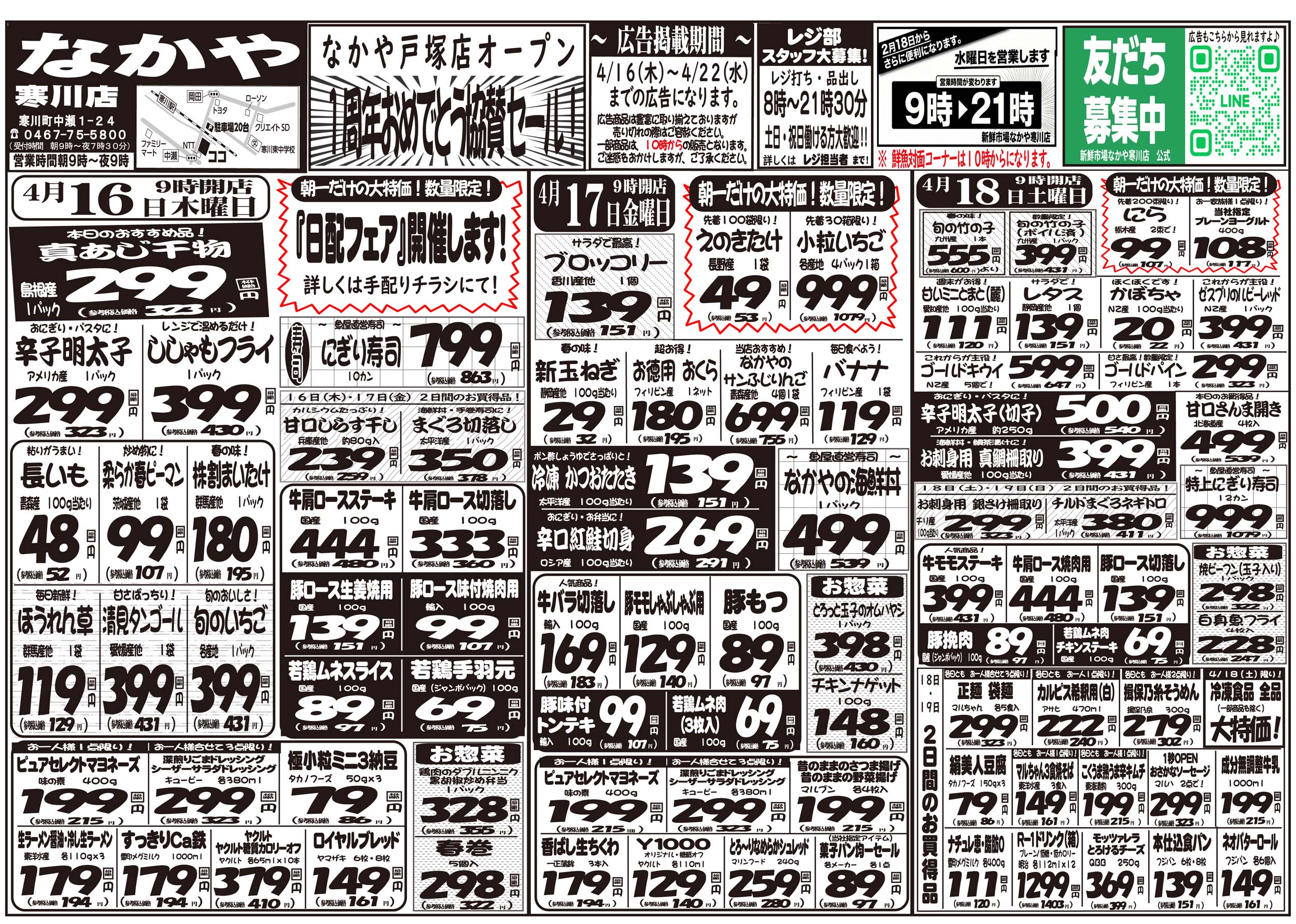 高座郡寒川町 新鮮市場 なかや 寒川店 お客様の冷蔵庫がわりにご利用下さい。お買い得商品は折込チラシでチェック! ピックアップニュース チラシ クチコミを見る・投稿する チラシ 広告有効期限:2026.04.16~2026.04.22 その他のネットチラシ 周辺のチラシを見る 周辺情報 グルメ ショッピング 車・バイク 住宅 暮らし 趣味・レジャー 美容・健康 周辺情報はありません このお店のTOPページへ 0467-75-5800 twitter Facebook Google+