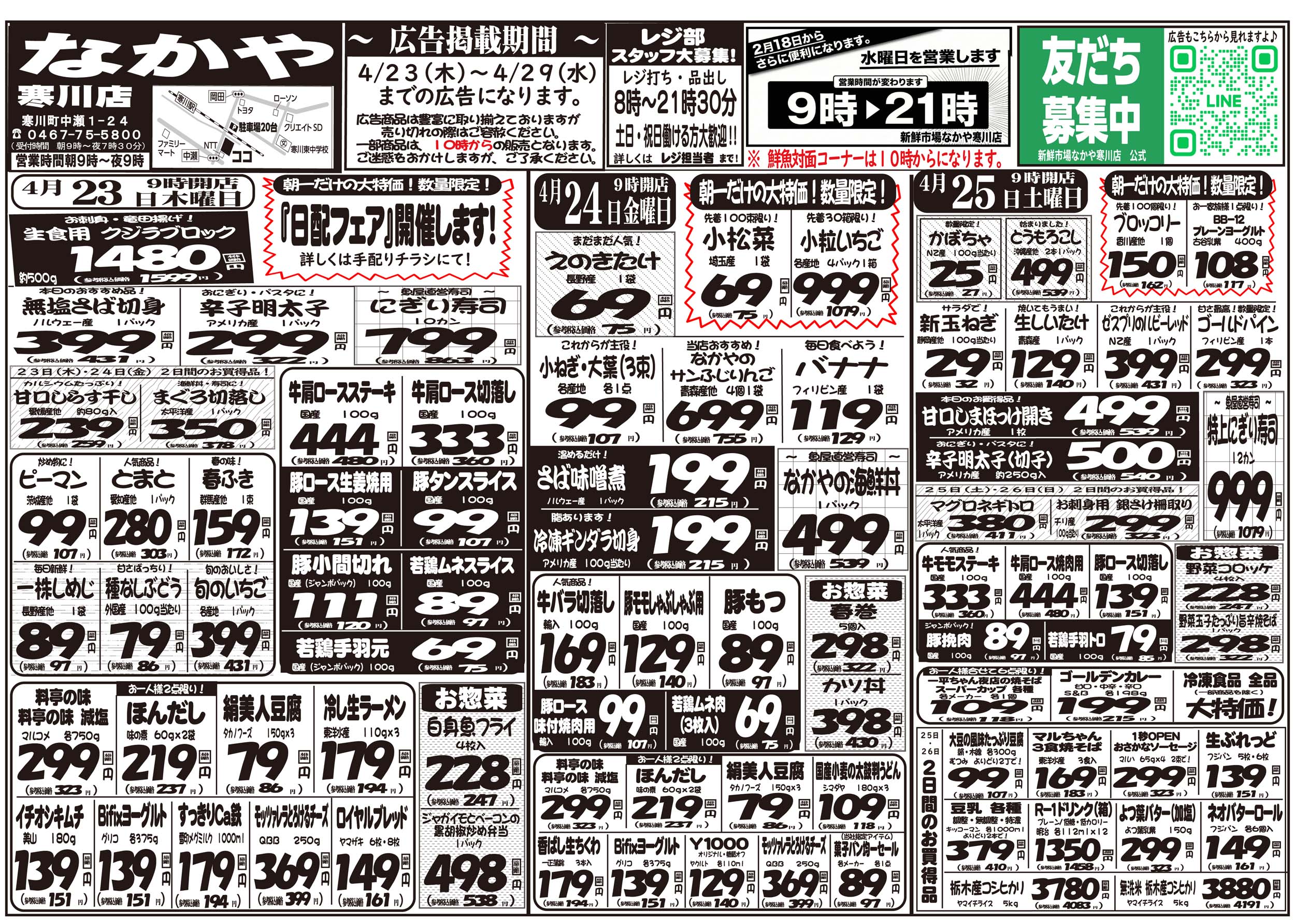 高座郡寒川町 新鮮市場 なかや 寒川店 お客様の冷蔵庫がわりにご利用下さい。お買い得商品は折込チラシでチェック! ピックアップニュース チラシ クチコミを見る・投稿する チラシ 広告有効期限:2026.04.23~2026.04.29 その他のネットチラシ 周辺のチラシを見る 周辺情報 グルメ ショッピング 車・バイク 住宅 暮らし 趣味・レジャー 美容・健康 周辺情報はありません このお店のTOPページへ 0467-75-5800 twitter Facebook Google+