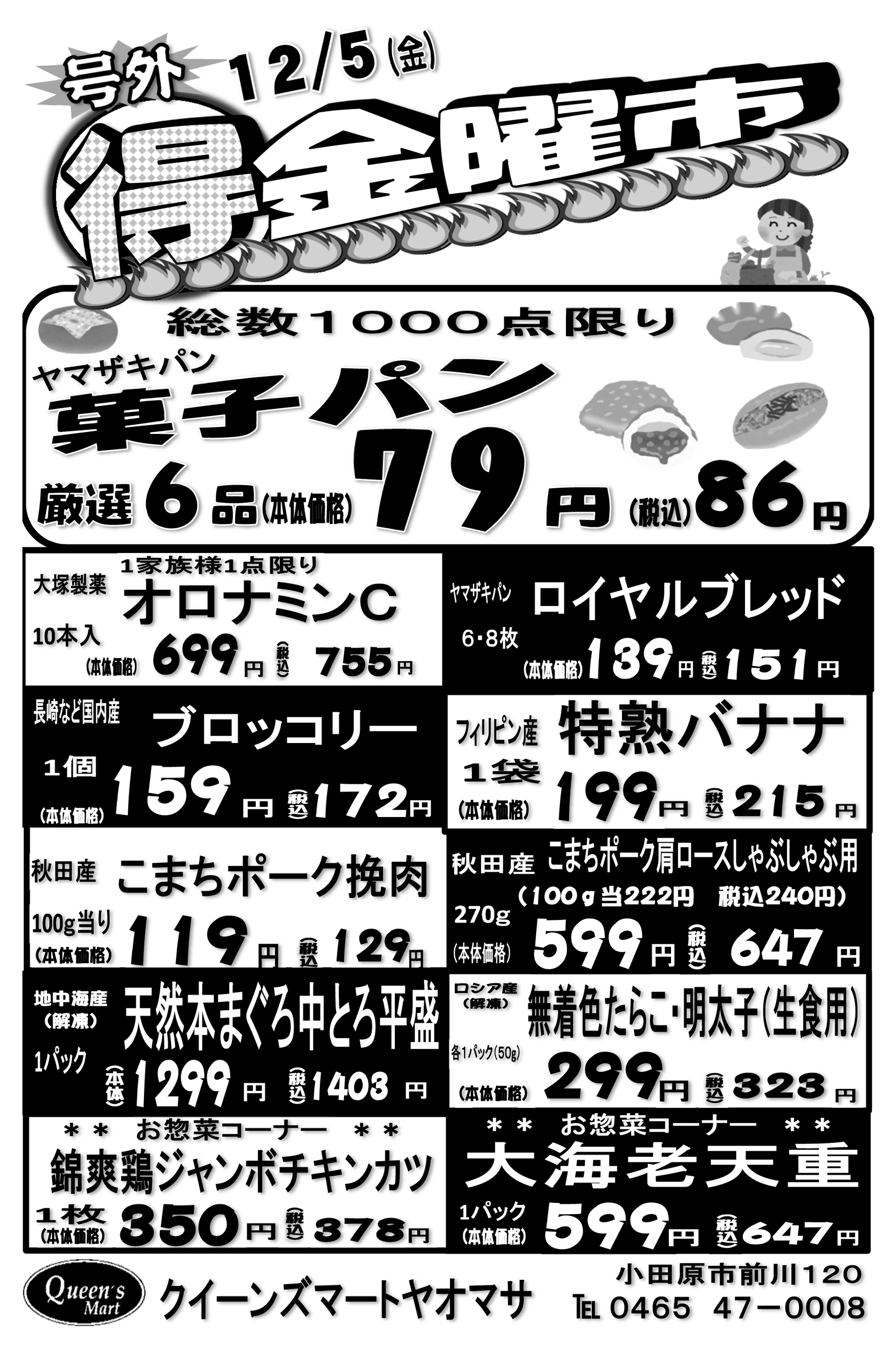 小田原市 クイーンズマート・ヤオマサ ヤオマサグループは、地域社会に密着し食文化を中心とした豊かな楽しい生活を地域の皆さまに提供します!お得で嬉しいイベントも満載!! ピックアップニュース ネットチラシ 料金・サービス クチコミを見る・投稿する もっと写真を見る ネットチラシ 広告有効期限:2025.12.05~2025.12.07 その他のネットチラシ 広告有効期限 2025/12/03~2025/12/07 周辺のチラシを見る 周辺情報 グルメ ショッピング 車・バイク 住宅 暮らし 趣味・レジャー 美容・健康 周辺情報はありません このお店のTOPページへ 0465-47-0008 twitter Facebook Google+