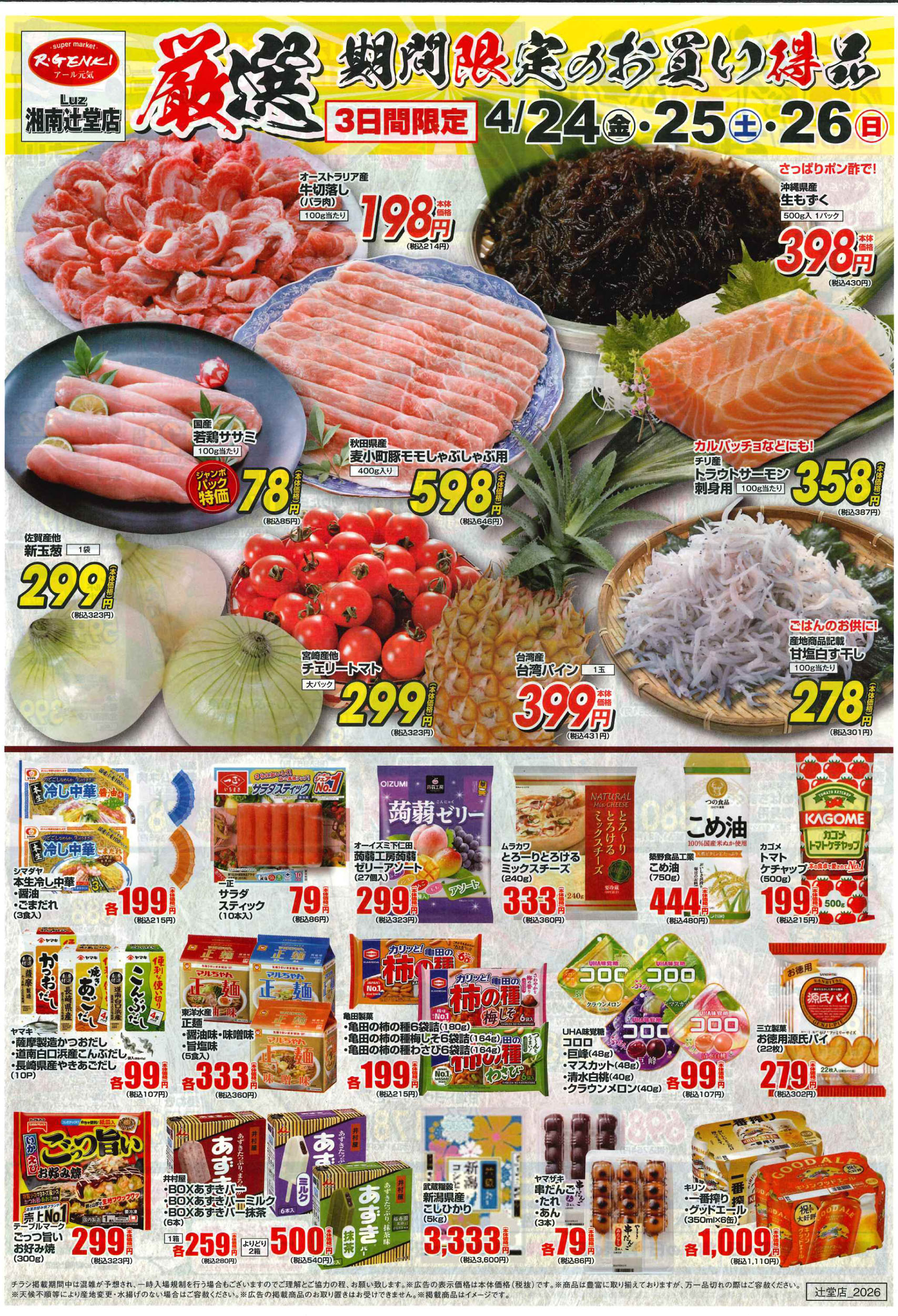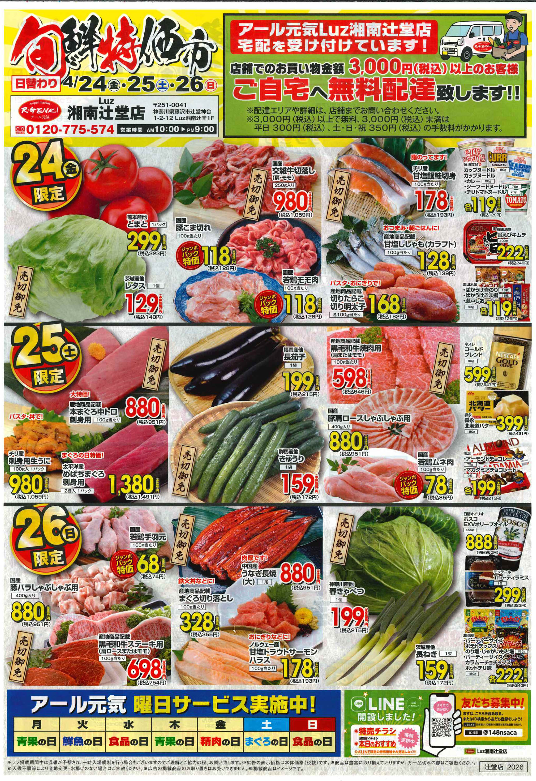 藤沢市 アール元気 Luz湘南辻堂店 JR東海道線「辻堂」駅北口より徒歩3分。お客様と直に接するスタッフが、市場でも厳選したものを毎日仕入れ、お客様のニーズにかなった品揃えで、鮮度の高い食材をリーズナブルな価格でご提供します。 ピックアップニュース ネットチラシ クチコミを見る・投稿する ネットチラシ 広告有効期限:2026.04.24~2026.04.26 その他のネットチラシ 周辺のチラシを見る 周辺情報 グルメ ショッピング 車・バイク 住宅 暮らし 趣味・レジャー 美容・健康 周辺情報はありません このお店のTOPページへ 0120-775-574 twitter Facebook Google+