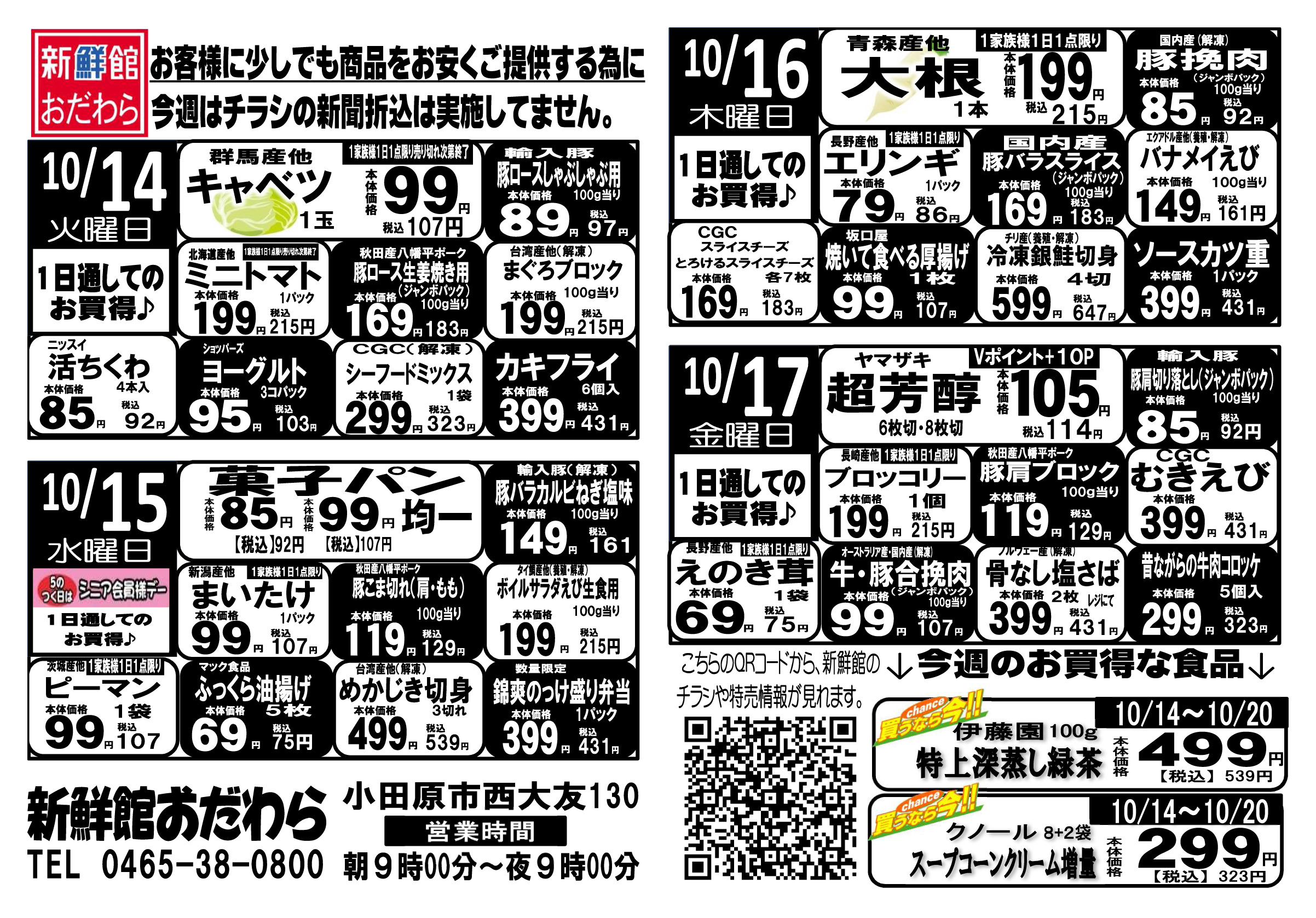 小田原市 新鮮館おだわら ヤオマサグループは、地域社会に密着し食文化を中心とした豊かな楽しい生活を地域の皆さまに提供します!お得で嬉しいイベントも満載!! ネットチラシ クチコミを見る・投稿する ネットチラシ 広告有効期限:2025.10.14~2025.10.20 その他のネットチラシ 周辺のチラシを見る 周辺情報 グルメ ショッピング 車・バイク 住宅 暮らし 趣味・レジャー 美容・健康 周辺情報はありません このお店のTOPページへ 0465-38-0800 twitter Facebook Google+