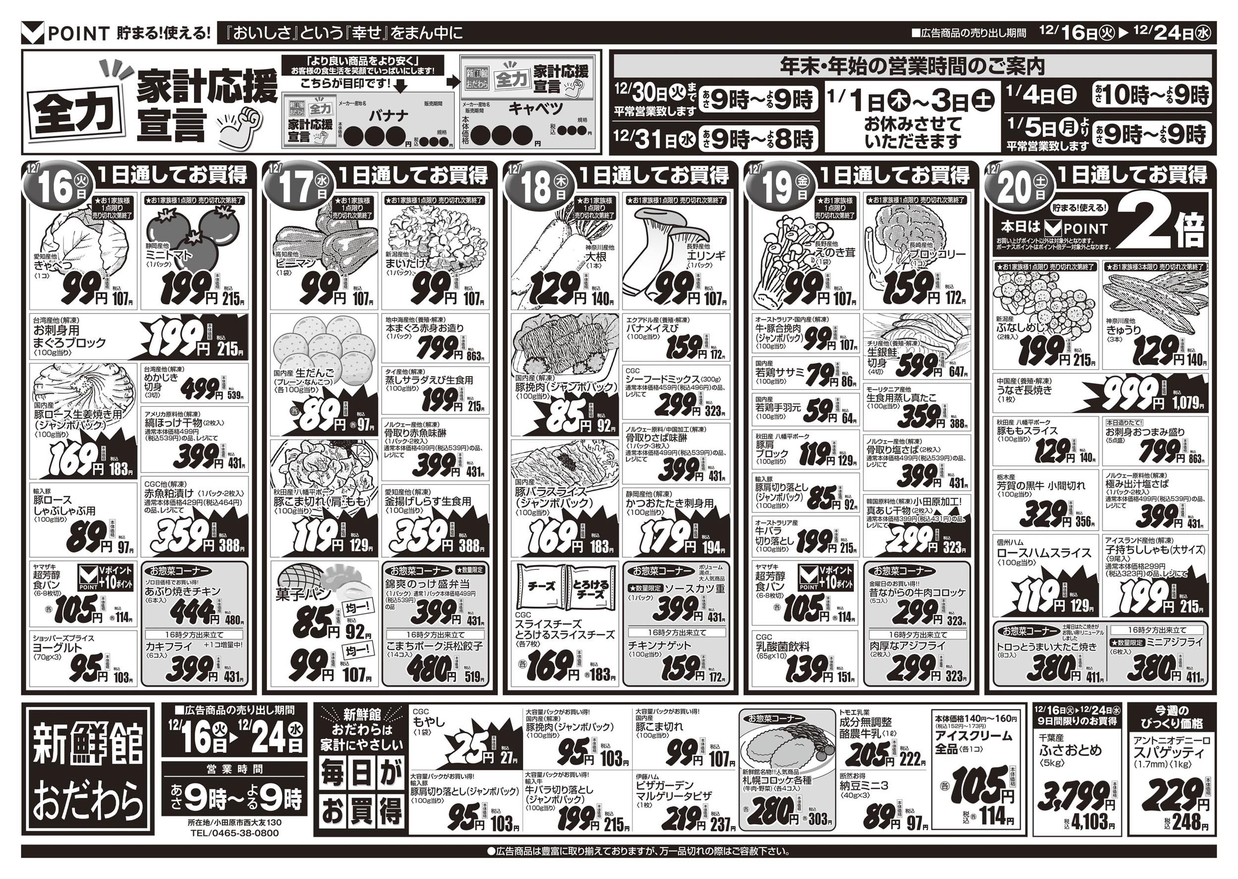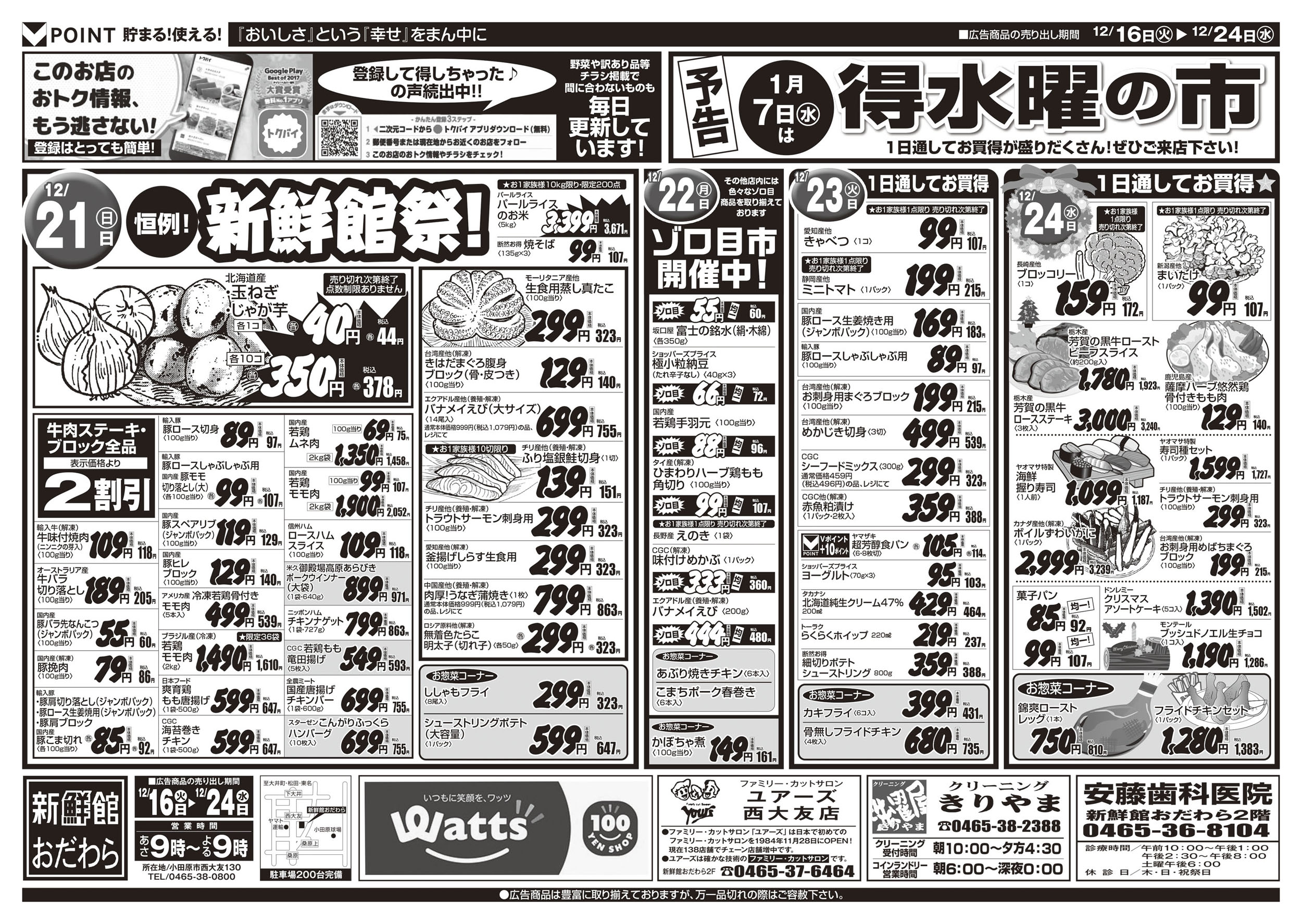 小田原市 新鮮館おだわら ヤオマサグループは、地域社会に密着し食文化を中心とした豊かな楽しい生活を地域の皆さまに提供します!お得で嬉しいイベントも満載!! ネットチラシ クチコミを見る・投稿する ネットチラシ 広告有効期限:2025.12.16~2025.12.24 その他のネットチラシ 周辺のチラシを見る 周辺情報 グルメ ショッピング 車・バイク 住宅 暮らし 趣味・レジャー 美容・健康 周辺情報はありません このお店のTOPページへ 0465-38-0800 twitter Facebook Google+