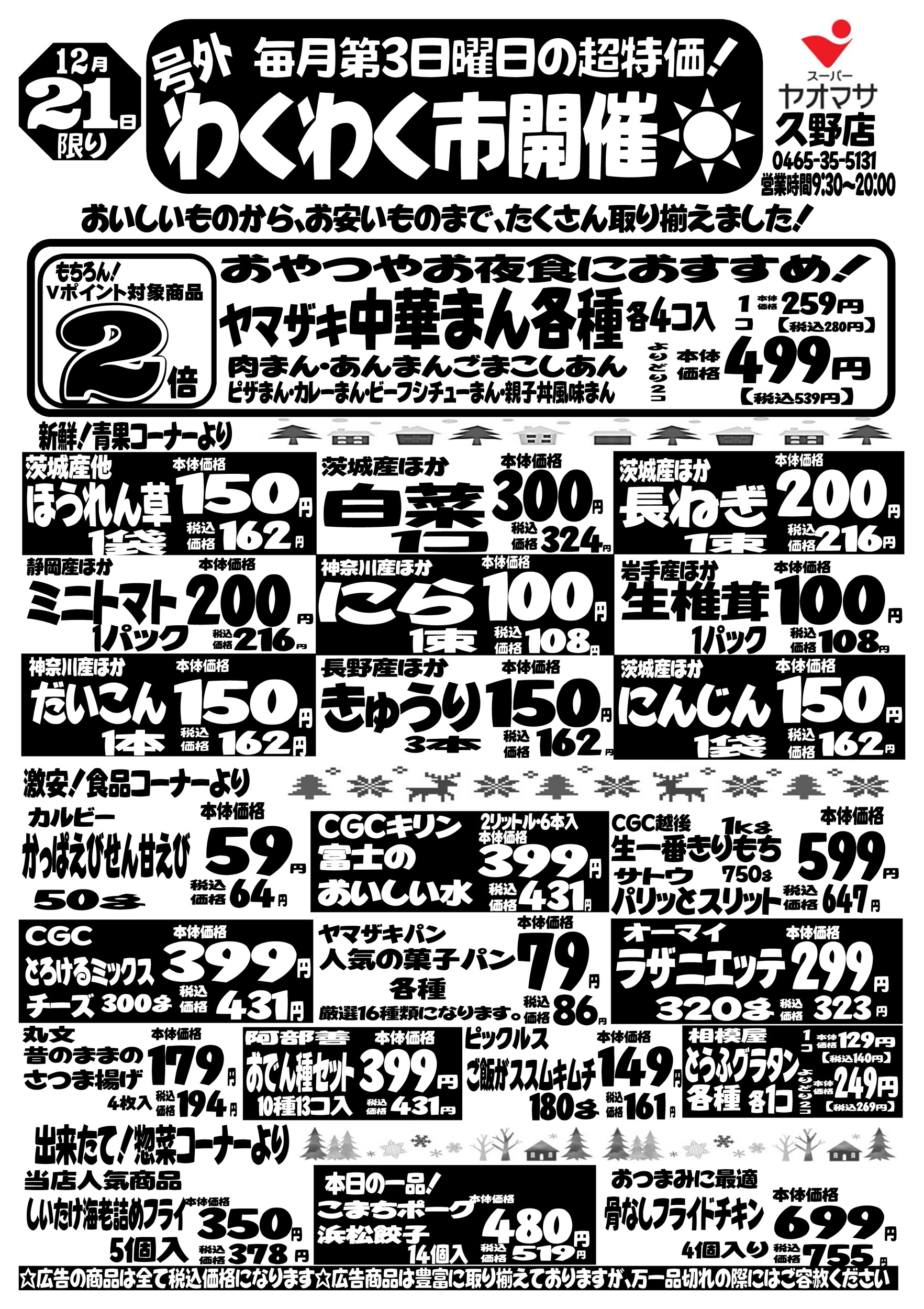 小田原市 ヤオマサ久野店 ヤオマサグループは、地域社会に密着し食文化を中心とした豊かな楽しい生活を地域の皆さまに提供します!お得で嬉しいイベントも満載!! ネットチラシ クチコミを見る・投稿する ネットチラシ 広告有効期限:2025.12.21~2025.12.21 その他のネットチラシ 広告有効期限 2025/12/17~2025/12/23 周辺のチラシを見る 周辺情報 グルメ ショッピング 車・バイク 住宅 暮らし 趣味・レジャー 美容・健康 周辺情報はありません このお店のTOPページへ 0465-35-5131 twitter Facebook Google+